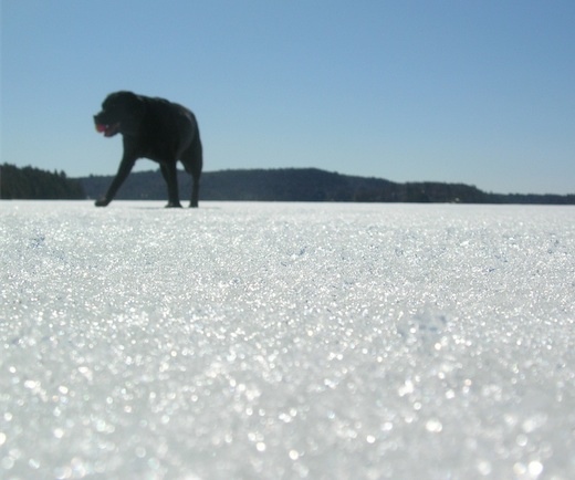 Canoe Lake (and Marley) from ice level, April 5th, 2008. [Photo by Hugh Statten]